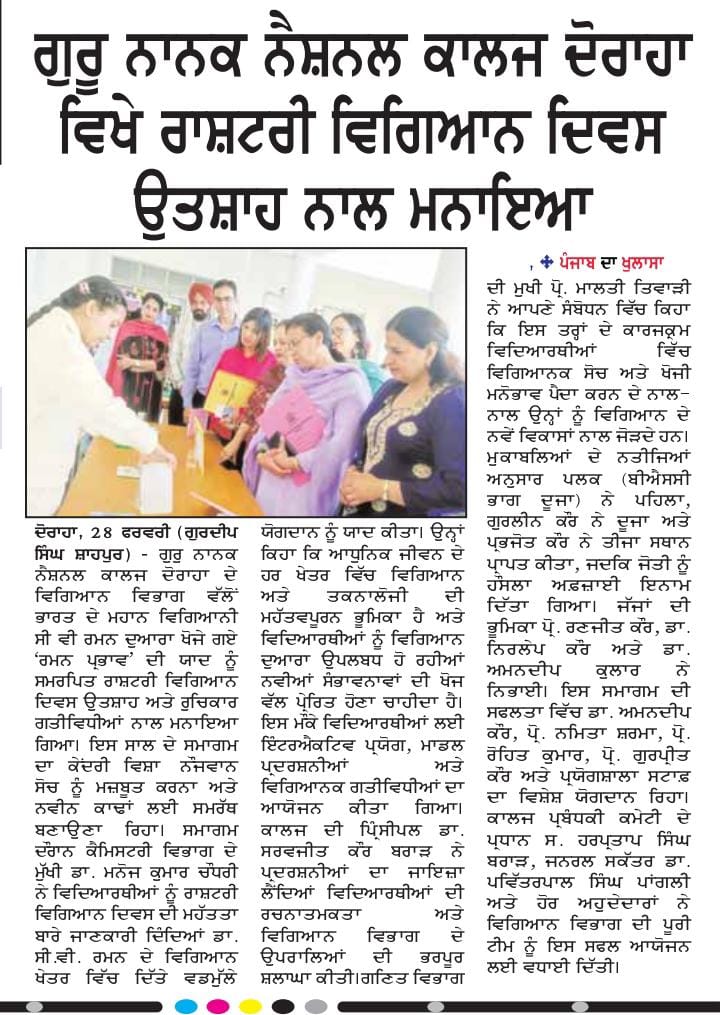 Guru Nanak National College, Doraha was established with the efforts of Late Dr. Ishwar Singh the founder President, S. Jagjit Singh Mangatthe founder Secretary and other prominent personalities of the area like Pandit Kidar Nath Sharma, S. Beant Singh the former Chief Minister of Punjab, S. Gurbaksh Singh Katani, Sh. Kewal Krishan Tandon, Sh. Krishan Chand Thapar, Sh. Om Prakash Bector, S. Jagdish Singh Gill and many others. Inspired by the teachings of Sri Guru Nanak Devji and dedicated to the 5th birth centenary of the great Guru.